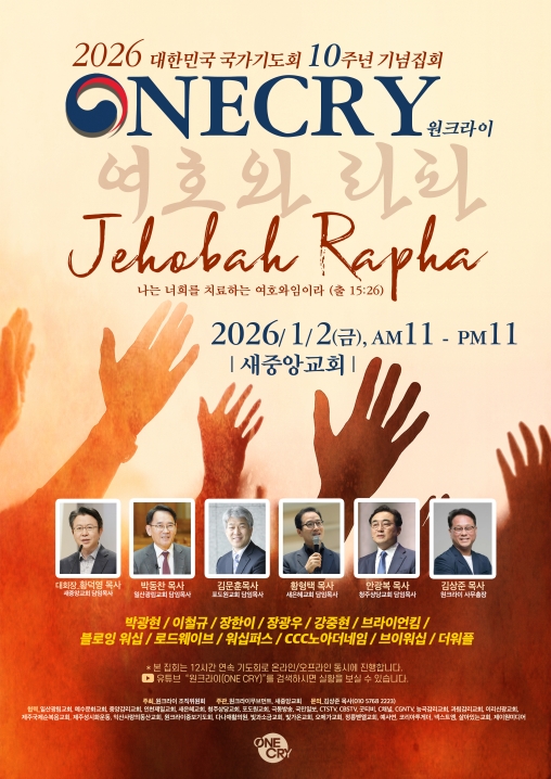 원크라이(One Cry) 기도회가 10주년을 맞아 202612, 새중앙교회에서 열렸다. 새해 벽두 열린 이번 집회는 한국교회와 나라를 위한 연합기도로 진행됐으며, “치유의 강물이 흐를 때 죽은 바다가 산다”, “기도는 자격이 아니라 자세다”, “예루살렘에서 땅끝까지 확장되는 기도라는 세 가지 흐름으로 정리됐다. 올해 원크라이의 핵심 메시지는 회복은 더 큰 외침이 아니라 더 깊은 낮아짐에서 시작된다는 점이었다.
