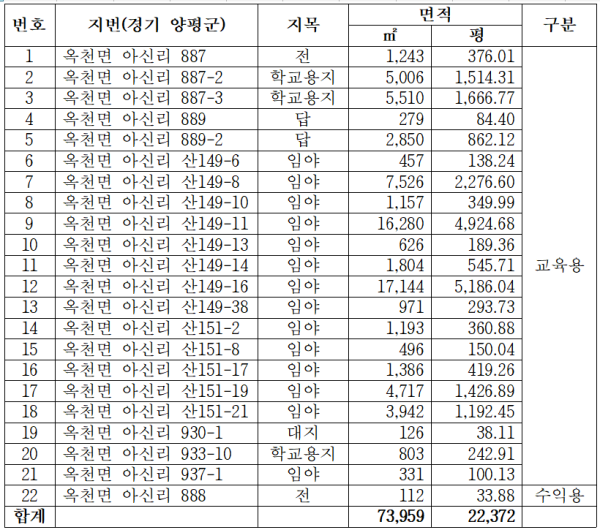 학교법인 아세아연합신학대학원 아신대학교는 2023. 11. 22.자로 학교홈페이지에 학교법인 소유의 부동산 22필지 73,959㎡(약 22,372평)를 수의계약에 의한 일괄매각조건으로 매각하겠다는 공고를 게시했다.