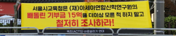 <사진설명-서울시교육청 앞에 ‘서울시교육청은 재단법인 아세아연합신학원의 빼돌린 기부금 15억을 더 이상 모른 척 하지 말고 철저히 조사하라’는 현수막이 달려있다>