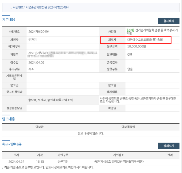 민 목사의 이 발언은 사실과 다르다. 민찬기 목사가 제기한 ‘선거관리위원회 결정 등 효력정지 가처분(2024카합20494)’에 채권자는 민찬기이고 채무자는 대한예수교장로회(합동) 총회다.