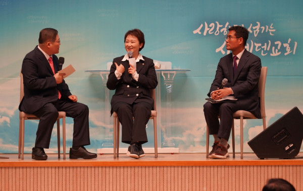 이날 새에덴교회는 조영길 변호사(법무법인 아이앤에스)를 초청해 차별금지법의 문제점에 대해 설명을 듣는 시간을 가졌다. 이후 간단한 토크쇼 형식을 즉석에서 제안해 소강석 목사가 사회를 진행하며, 이언주 의원과 조영길 변호사에게 질문을 이어갔다.