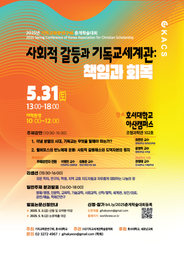 2025년 기독교학문연구회 춘계학술대회가 '사회적 갈등과 기독교세계관: 책임과 회복'이라는 주제로 5월 31일 호서대학교 아산캠퍼스에서 열린다.