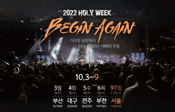 서울기독청년연합회가 주관하는 제13회 홀리위크가 ‘Begin Again-거리와 광장에서 다시 시작하는 예배와 부흥’이라는 주제로 10월3~9일 개최된다.
