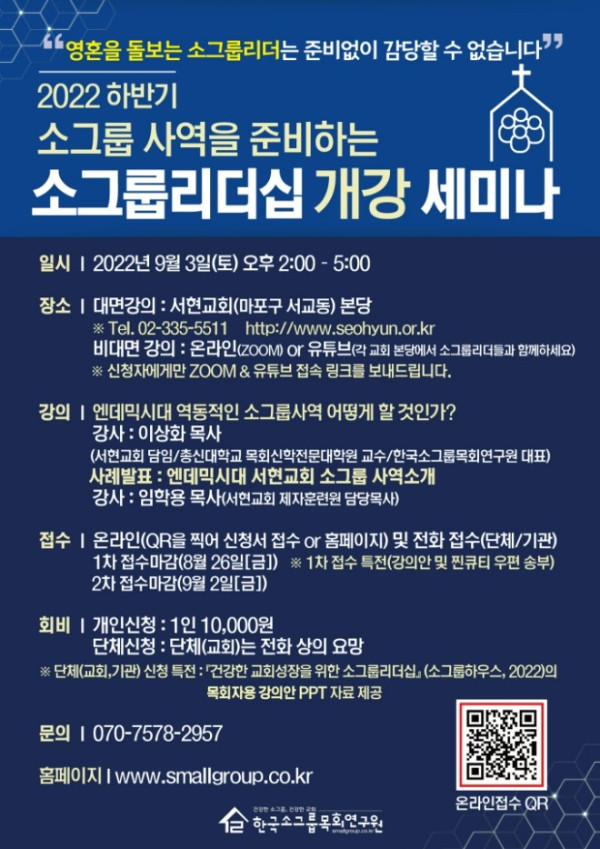한국소그룹목회연구원(대표 이상화 목사, 이하 한소연)이 9월3일 서현교회에서 ‘2022 하반기 소그룹 사역을 준비하는 소그룹 리더십 개강 세미나’를 개최한다고 밝혔다. 이번 세미나는 현장 강의와 온라인 강의를 병행하여 진행될 예정이다.