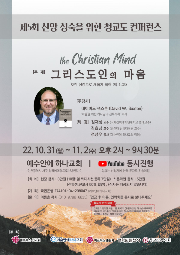 이번 컨퍼런스는 미국 오하이오주에서 목회를 하고 있는 데이비드 색스톤을 초청해서 진행되며 조엘 비키가 학장으로 있는 미국 퓨리탄리폼드신학교에서 신학석사 학위를 받은 ‘마음의 위한 하나님의 전투계획’의 저자이다. 주제는 ‘그리스도인의 마음’으로 묵상의 중요성 및 방법에 대해서 청교도 및 개혁주의자들의 가르침을 강의할 예정이다.