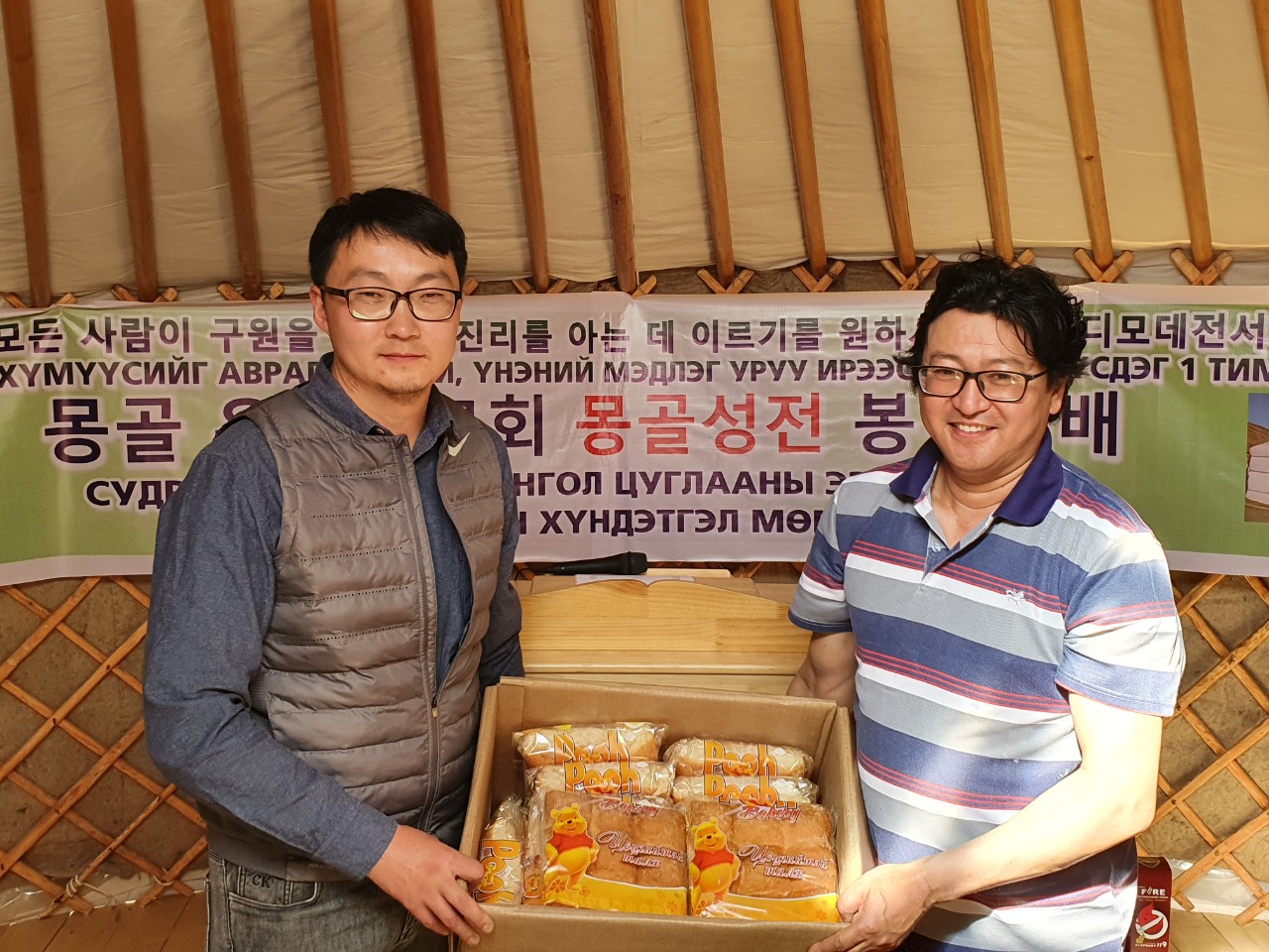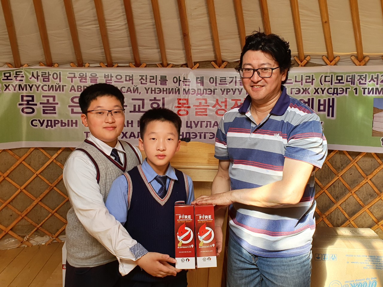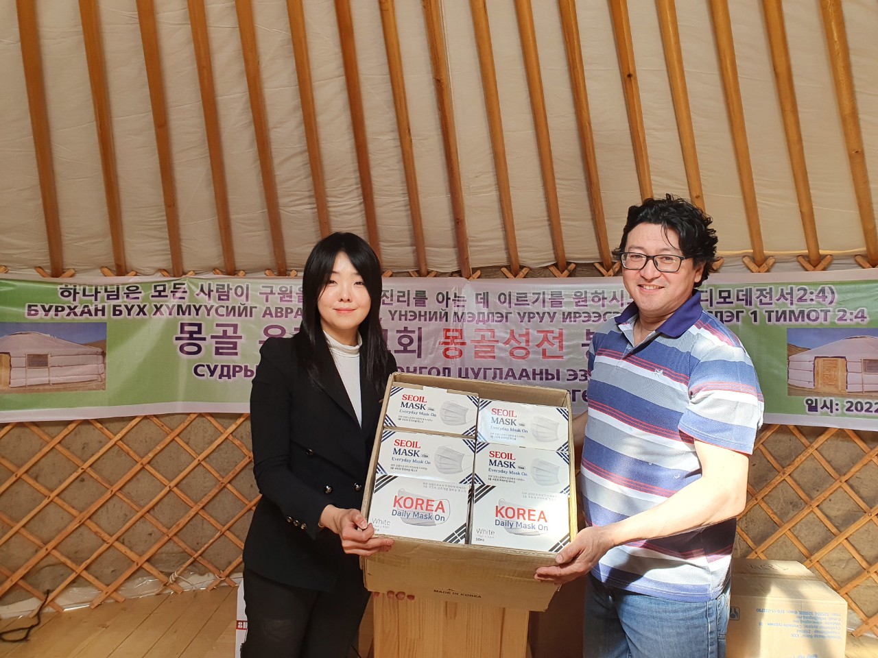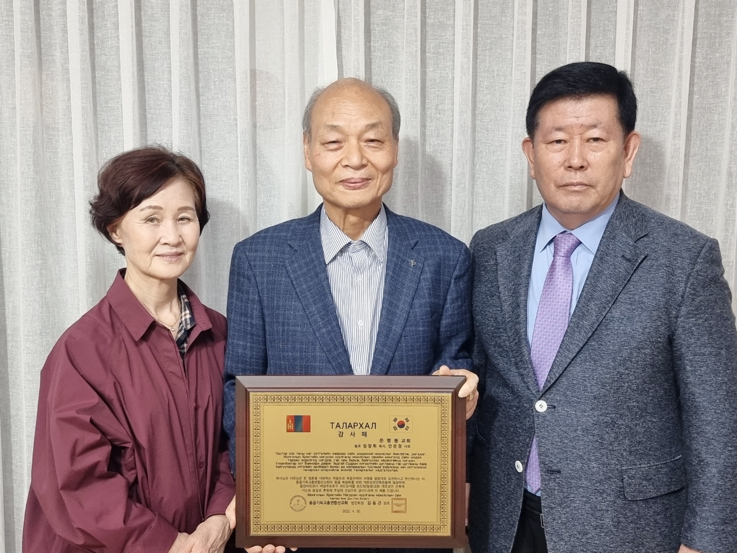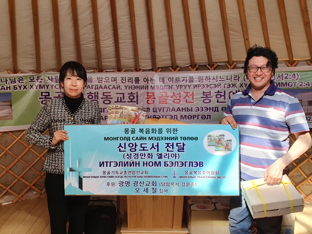 몽기총 법인회장 김동근장로는 몽골 복음화를 위한 몽기총의 사역에 적극 동참하여 몽골 은행동교회 게르성전을 건축 후원한 한국 성남 은행동교회 원로 임창희 목사와 안은정 사모에게 감사패를 전달하고, 몽골 은행동교회(쏘드링교회)에 게르성전 뿐 아니라 몽기총에서 직접 제작한 강대상, 강단, 간판과 앰프, 마이크, 의자 등의 성물과 한국 광명 함께하는교회(담임 이상재목사)에서 후원한 마스크, 모자와 (주)DK글로벌에서 후원한 친환경 간이소화기와 성도들과 나눌 빵을 선물했다.