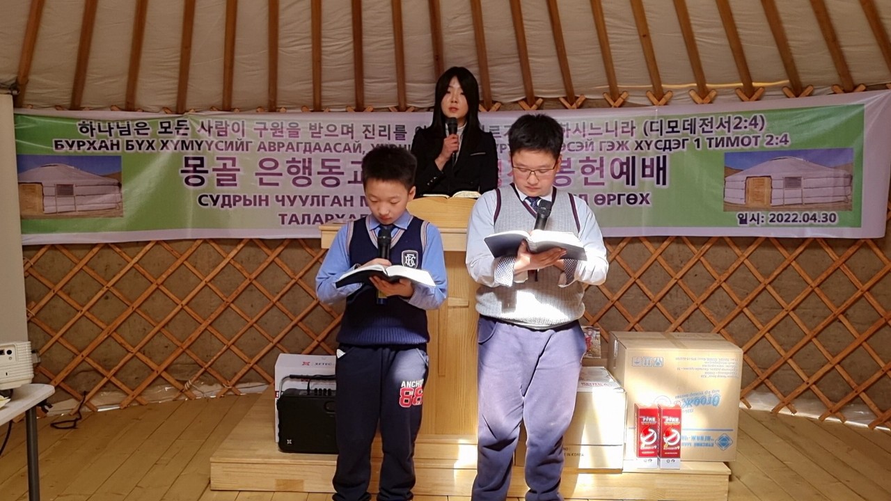 몽기총 김명자 권사가 대표기도하고, 요한복음3: 16 말씀을 몽기총 손혜미 간사가 봉독한 후 전은총 전은혁 형제가 몽골어로 성경봉독했다.