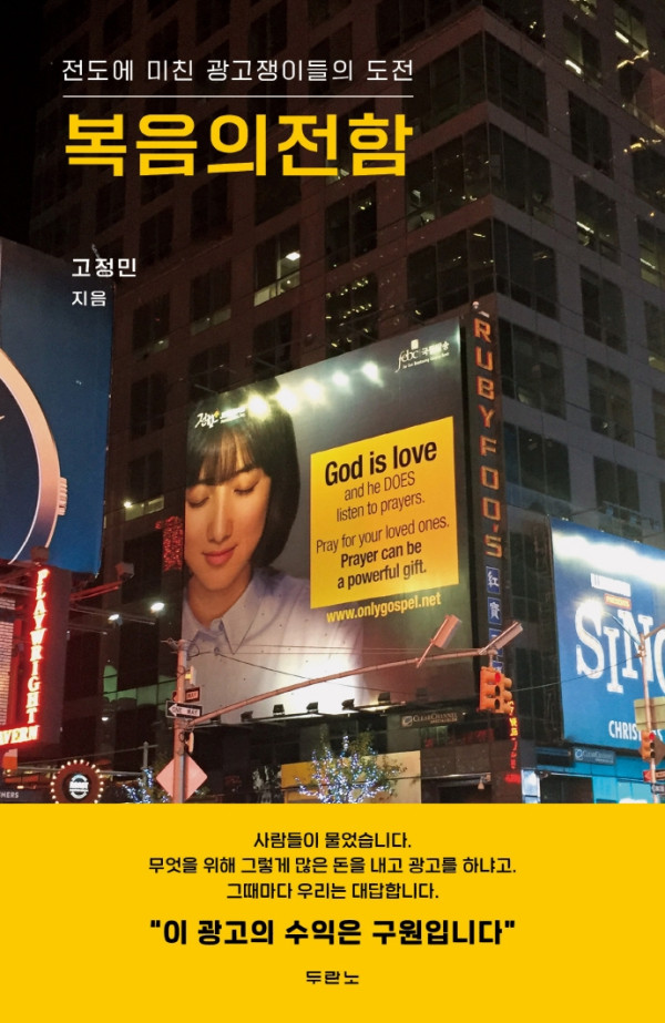 상업 광고를 전문으로 하던 저자는 하나님의 전적인 개입하심으로 운영하던 광고 회사를 과감히 내려놓고 복음만을 전하는 복음의전함을 시작하게 되었다. 2014년 창립 후부터, 하나님의 계획은 수많은 달란트를 통하여 재능으로 기부되고, 지역과 인종과 언어를 넘어 네크워크로 연결되어 땅끝마을에서 뉴욕 타임스퀘어까지 복음광고는 선포될 수 있었다. 재정이 없어서, 사람이 없어서, 협력 기관이 없어서도 아닌 하나님을 향한 전적인 순종만이 가장 중요했음을 고백할 수밖에 없다.