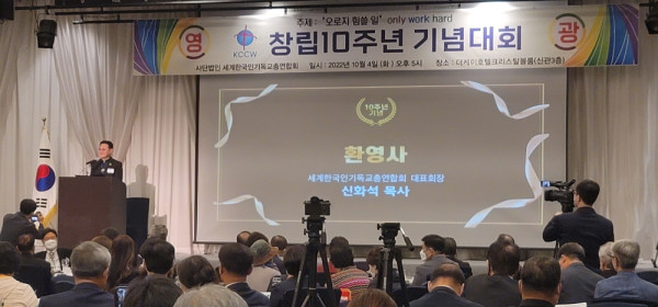 사단법인 세계한국인기독교총연합회(대표회장 신화석 목사) 창립 10주년 기념대회가 4일 더케이호텔크리스탈볼룸에서 열렸다.