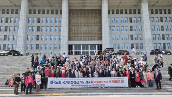 국가비상긴급기도운동본부가 제21대 대통령 선거를 앞두고 긴급 기도 선언문8일 국회의사당 앞에서 발표했다. 이번 선언에는 서울특별시교회총연합회를 비롯한 여러 기독교 단체와 국회의원, 목회자 등이 동참했다.