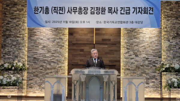 한국기독교총연합회(한기총) 전 사무총장 김정환 목사가 18일 기독교연합회관에서 긴급 기자회견을 열고, 자신을 둘러싼 각종 의혹에 대해 정면 반박했다. 김 목사는 “한기총을 위해 일했을 뿐 단 1원의 비리도 없다”며 “소명 기회조차 없이 면직된 것은 명백한 절차 위반”이라고 주장했다.