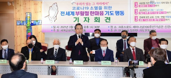 세계를 혼란에 빠트린 코로나-19 소멸하기 위한 기도운동이 펼쳐진다. 세계교회연합기도운동(공동대표 윤보환 감독)은 지난 9일 서울시 종로구 한국교회100주년기념관 신관 4층 크로스로드선교회 세미나실에서 ‘코로나-19 소멸을 위한 전 세계 부활절 한마음 기도 행동’에 대한 기자회견을 개최했다.