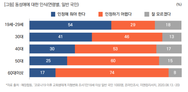 일반 국민의 동성애 인식을 연령별로 살펴보면, 20대에서는 동성애 부정 인식보다는 긍정 인식이 높으며, 30대부터는 부정 인식이 더 높다. 60대 이상 고령층에서는 부정(74%)과 긍정(17%) 간에 4배 이상 큰 격차를 보이고 있다.