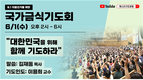 국가를 위한 기도운동을 16년간 펼쳐온 에스더기도운동본부(대표 이용희 교수)는 6월 1일 실시되는 제8회 전국동시지방선거일에 「6.1지방선거를 위한 국가금식기도회」를 개최한다.