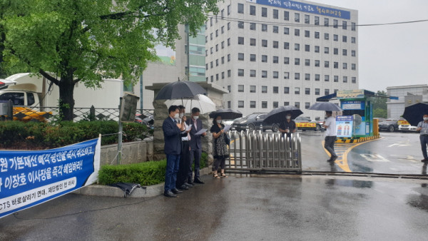 이들은 서울시교육청 앞에서 성명서를 통해 “서울교육청 조희연 교육감은 재단법인 기본재산 매각 의혹을 밝혀라”며 “당장 매각 승인을 취소하고, 온갖 불법과 비리 덩어리인 재단 특별 감사를 실시하고, 이장호 이사장을 즉각 해임하라”고 요구했다.