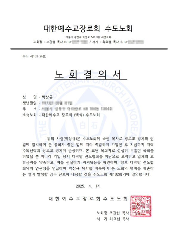 2025년 4월 14일 수도노회는 박 목사에 대한 이단성 의혹을 공식적으로 부정하는 결의서를 채택했다. 결의서에 따르면, 박 목사는 백석총회 신학과 정치질서에 따라 적법하게 소속된 목회자로서 “어떠한 이단성과 관련된 문제도 없다”고 명시했다.