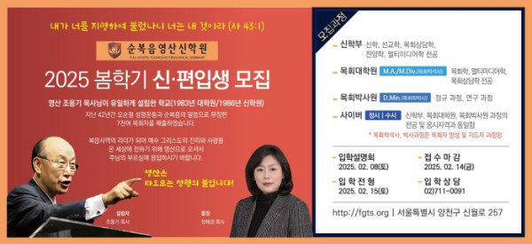 영산 조용기 목사가 유일하게 설립한 순복음영산신학원(총장 장혜경 목사)이 2025학년도 봄학기 신·편입생을 모집한다.