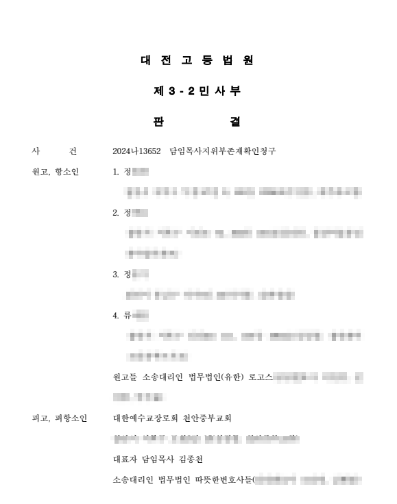 최근 대전고등법원이 김종천 목사를 상대로 ‘담임목사 지위부존재확인청구’ 소송에서 정모 장로 외 3명의 항소 모두를 기각했다. 이들은 1심에 이어 2심도 패소한 것이다.