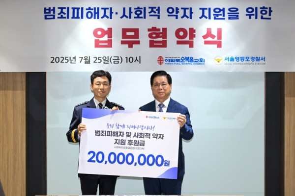 여의도순복음교회(담임목사 이영훈)는 7월 25일 서울영등포경찰서(지지환 서장)와 함께 범죄피해자 및 사회적 약자 지원을 위한 업무협약(MOU)을 체결했다.