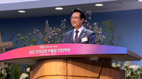 오정현 목사는 사랑의교회 섬김과 성도들의 헌신에 대해 감사하며 인사말씀을 전했다. 오 목사는 “백 년에 한 번 올까 말까 한 역사의 불청객으로 찾아온 코로나 팬데믹 상황 가운데서도 우리 한국교회가 진보와 보수를 다 아울러 68개 단체와 교단이 부활절연합예배를 드리게 하심이 너무나 영광스럽고 주님께 찬양드린다”며 “영적 공공재로 쓰임받은 것이 너무 감사하다”고 전했다.