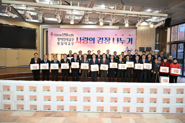 여의도순복음교회는 23일 여의도 교회 베다니광장에서 ‘사랑의 김장 나누기’ 전달식을 갖고 김장김치 10킬로그램 들이 2565박스를 장애인대교구와 탈북자들로 조직된 통일대교구에 전달했다.