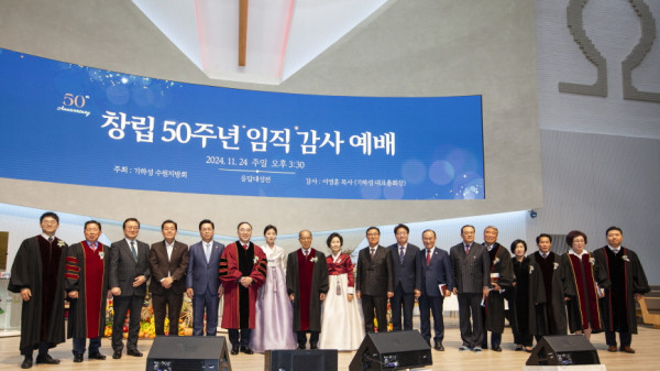 수원의 복음화를 위해 한길을 걸어온 수원순복음교회(이요한 목사)가 24일 창립 50주년 임직 감사예배를 드렸다.