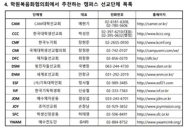 또한 신입생들은 자신이 초대받은 성경 공부 모임이나 동아리가 정통 기독교 단체인지 확인하는 것이 중요하다. 학복협은 “기독교 선교단체라고 하지만, 모임의 주요 강사가 누구인지, 어떤 교리를 가르치는지 꼼꼼히 따져보아야 한다”며 “특히 ‘새로운 진리를 알려준다’, ‘성경의 비밀을 해석해준다’는 식의 접근을 받을 경우 경계해야 한다”고 당부했다.