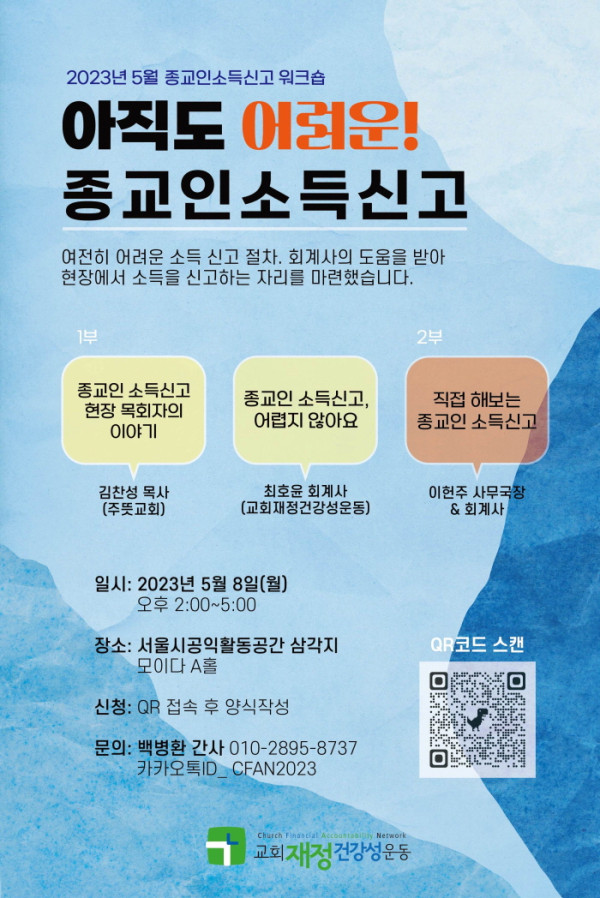 교회재정건강성운동은 이에 종교인소득신고 기간인 5월을 맞아 “아직도 어려운! 종교인소득신고”라는 주제로 워크숍을 개최한다.