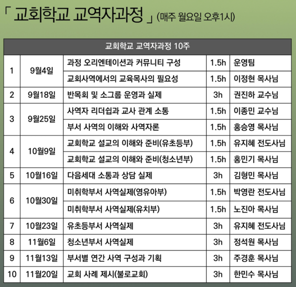 담당교수진은 이종민 교수(총신대), 권진하 대표(교회교육훈련개발원)를 비롯해, 홍승영 목사(장지교회), 이정현 목사(청암교회), 홍민기 목사(라이트하우스무브먼트), 주경훈 목사(오륜교회 꿈미), 한민수 목사(불로교회, 어사연), 정석원 목사(예수향남교회), 노진아 목사(충신교회) 등이다.