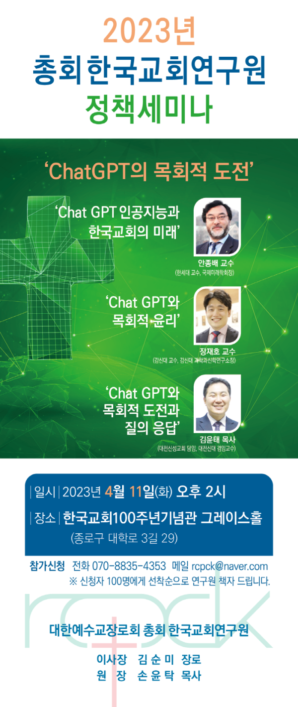 이번 정책 세미나는 ‘2023년 총회한국교회연구원 정책세미나’로, 오는 4월 11일 오후 2시, 장소는 한국교회100주년기념관 1층 그레이스홀에서 열린다. 세미나 주제는 ‘ChatGPT의 목회적 도전’으로, 참여자들은 ChatGPT에 대한 이해를 확장하고, 목회적 응용 사례를 소개하며, 한국교회의 미래를 준비하는 시간을 가질 계획이다.