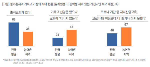 농어촌 지역 개신교인 학부모들에게 ‘자녀의 교회 출석 여부’를 묻는 질문에 ‘출석교회가 있다’라고 응답한 경우는 38%로 전국 평균(63%)을 훨씬 밑돌았다.