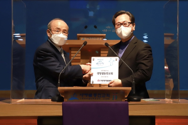 충남 아산시에 위치한 생명샘동천교회(위임목사 박귀환)는 21일 주일, 설립 60주년을 기념해 사랑의장기기증운동본부(이사장 박진탁, 이하 본부)의 박진탁 목사를 초청해 1, 2, 3부에 걸쳐 ‘생명나눔 예배’를 드렸다. 이번 생명나눔 예배는 코로나19 상황을 고려해 대면 뿐 아니라 비대면 방식으로도 진행됐다.