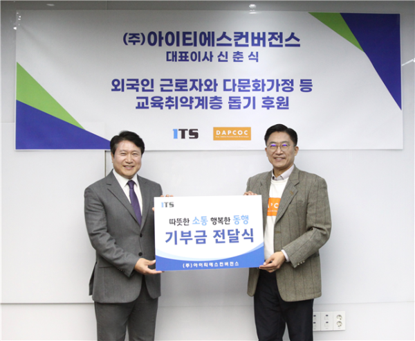 ㈜아이티에스컨버젼스(대표이사 신춘식)는 최근 (사)대학을위한마약중독예방재활센터(이하 답콕. DAPCOC Drug Addiction Prevention-Rehabilitation Center On the Campus. 이사장 두상달)에 외국인근로자·다문화가정 등 교육 취약계층 지원과 마약류 중독 예방 활동을 위해 후원금을 전달했다. 이번 기부는 단순한 물질적 나눔을 넘어, 사회 문제 해결에 기업이 직접 참여하겠다는 실천 의지를 담고 있다.