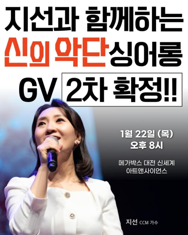 한편 지선은 지난 연말 본인이 지휘하는 대전월드비전합창단과 함께 ‘우리는 모두 소중해’라는 앨범을 발매했고, 이번 싱어롱 상영회가 있는 대전의 목원대학교 신학대학원 찬양사역학과 주임교수로 재직하며 국내외 찬양사역도 활발히 진행하고 있다.